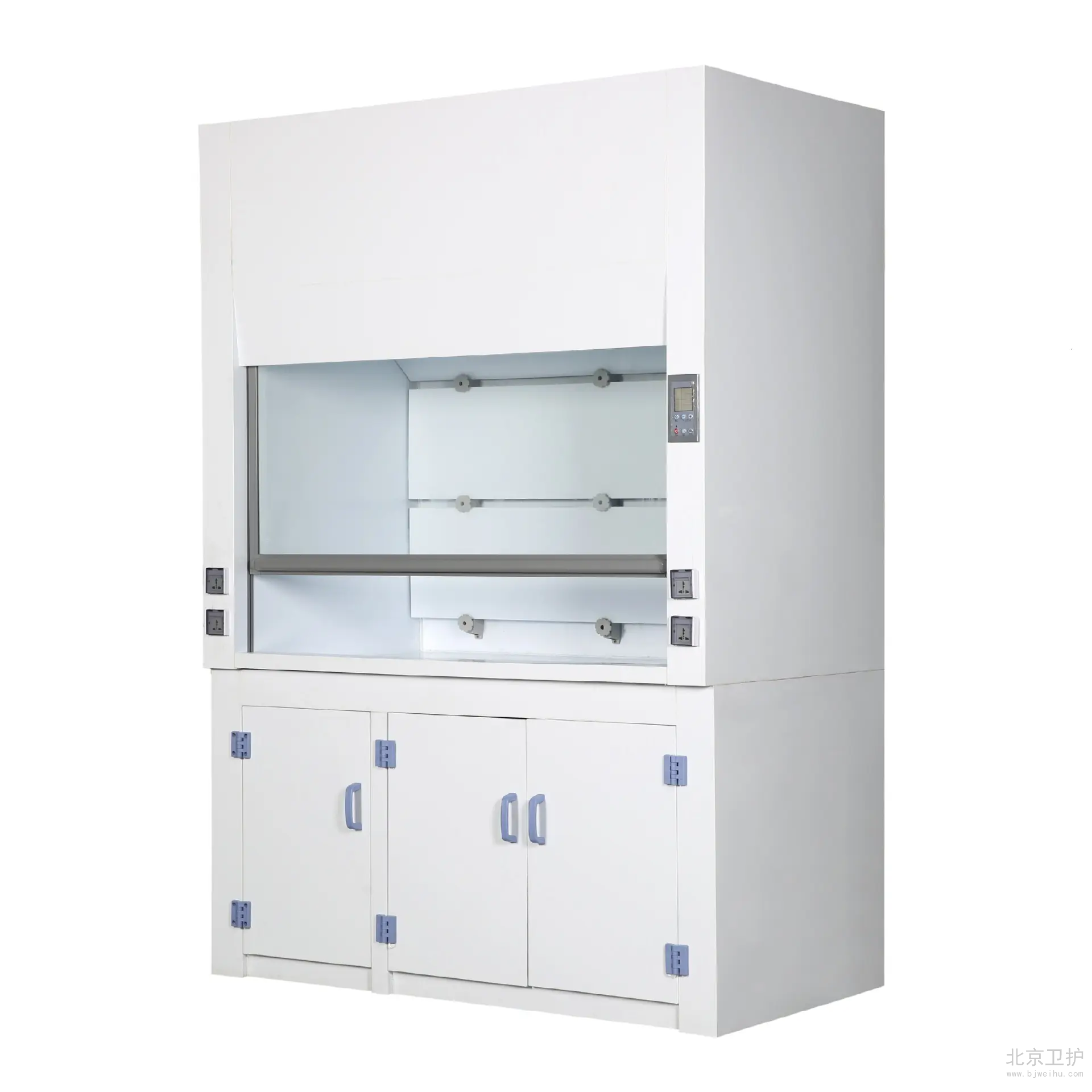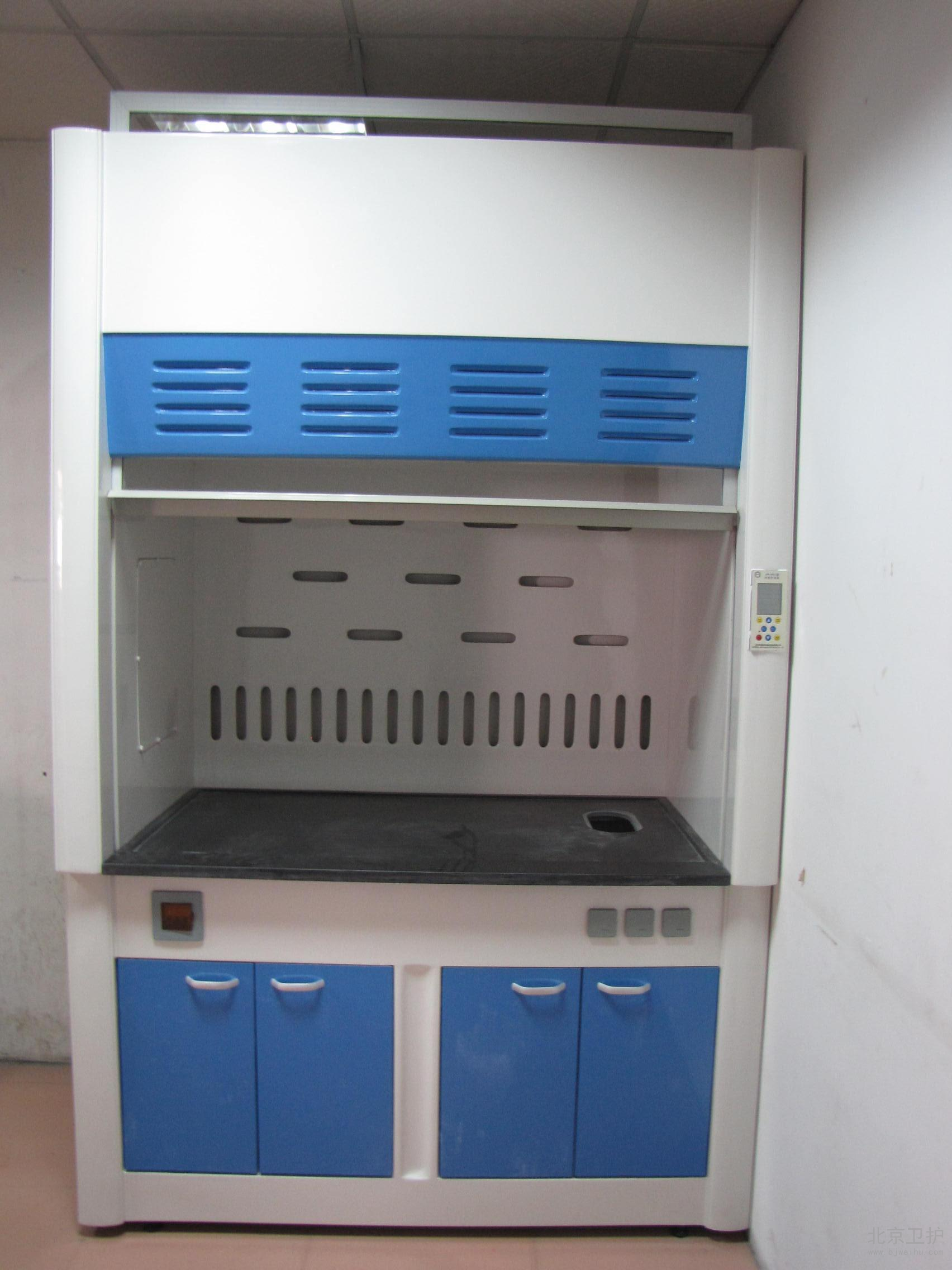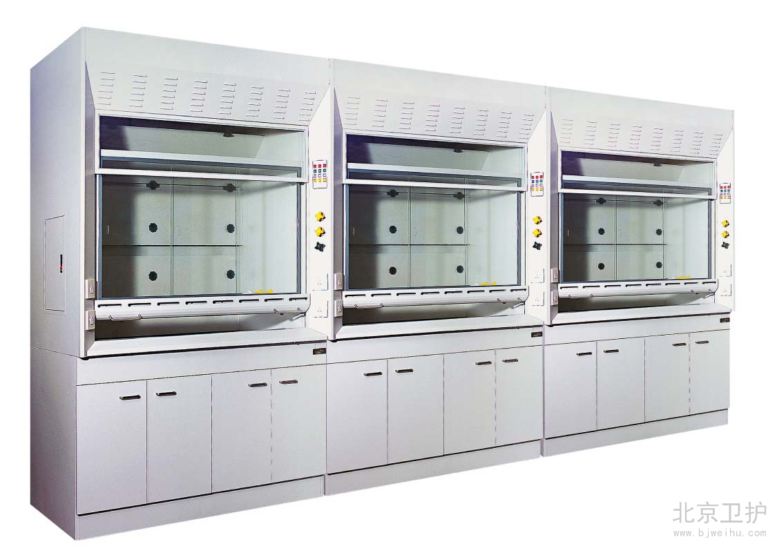 通風(fēng)柜是實(shí)驗(yàn)室家具中必不可少的一種。在實(shí)驗(yàn)室中起到排風(fēng)和換氣的功效。通風(fēng)柜的結(jié)構(gòu)是上下式,其頂部有排氣孔,可安裝風(fēng)機(jī)。上柜中有導(dǎo)流板,電路控制觸摸開(kāi)關(guān),電源插座等 ,透視窗采用鋼化玻璃,可左右或上下移動(dòng)。供人操作。下柜采用實(shí)驗(yàn)邊臺(tái)樣式,上面有臺(tái)面,下面是柜體。臺(tái)面可安裝小水杯和龍頭。通風(fēng)柜的材料由多種的,全鋼、鋼木、全木、鋁木、塑鋼、PVC結(jié)構(gòu)等,其臺(tái)面是直接與操作者接觸的地方,由實(shí)芯理化板,不銹鋼板,PVC,陶瓷等材料組成。舊式通風(fēng)柜多用木材制成,但現(xiàn)代多為涂有環(huán)氧樹(shù)脂的鋼材制造。常見(jiàn)柜寬為1000、1200、1500、1800和2000毫米幾個(gè)規(guī)格,深700-900毫米,高1900-2400毫米??晒?-3個(gè)人同時(shí)使用。 通風(fēng)柜一般靠墻安裝。前方中間為可上下移動(dòng)的透明門(mén)(多為玻璃),開(kāi)啟高度一般為100-600毫米。門(mén)后為實(shí)驗(yàn)進(jìn)行的工作面,有水管、下水道、電源、真空泵、氣路管線等實(shí)驗(yàn)需要的連接,上有帶保護(hù)罩的燈照明。空氣由柜內(nèi)前上方的排風(fēng)扇抽走后,或經(jīng)管道引到別處(稱(chēng)為全通風(fēng)),或經(jīng)過(guò)濾重新循環(huán)使用(成為無(wú)管通風(fēng))。多數(shù)通風(fēng)柜在(1)排氣量過(guò)小(2)前方玻璃門(mén)開(kāi)啟過(guò)大的時(shí)候會(huì)發(fā)出警報(bào),提醒操作者注意,一般玻璃門(mén)開(kāi)啟后操作口風(fēng)速不應(yīng)低于0.5m/s,內(nèi)部的排風(fēng)扇速度和燈都有開(kāi)關(guān)可調(diào)。使用的時(shí)候人站或坐于柜前,將玻璃門(mén)盡量放低,手通過(guò)門(mén)下伸進(jìn)柜內(nèi)進(jìn)行實(shí)驗(yàn)。由于排風(fēng)扇通過(guò)開(kāi)啟的門(mén)向內(nèi)抽氣,在正常情況下有害氣體不會(huì)大量溢出。