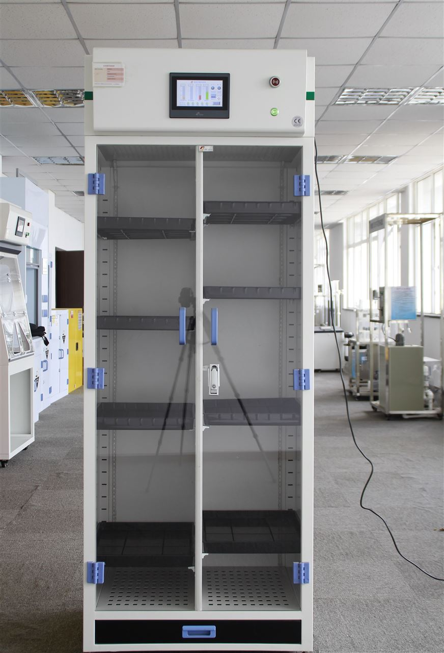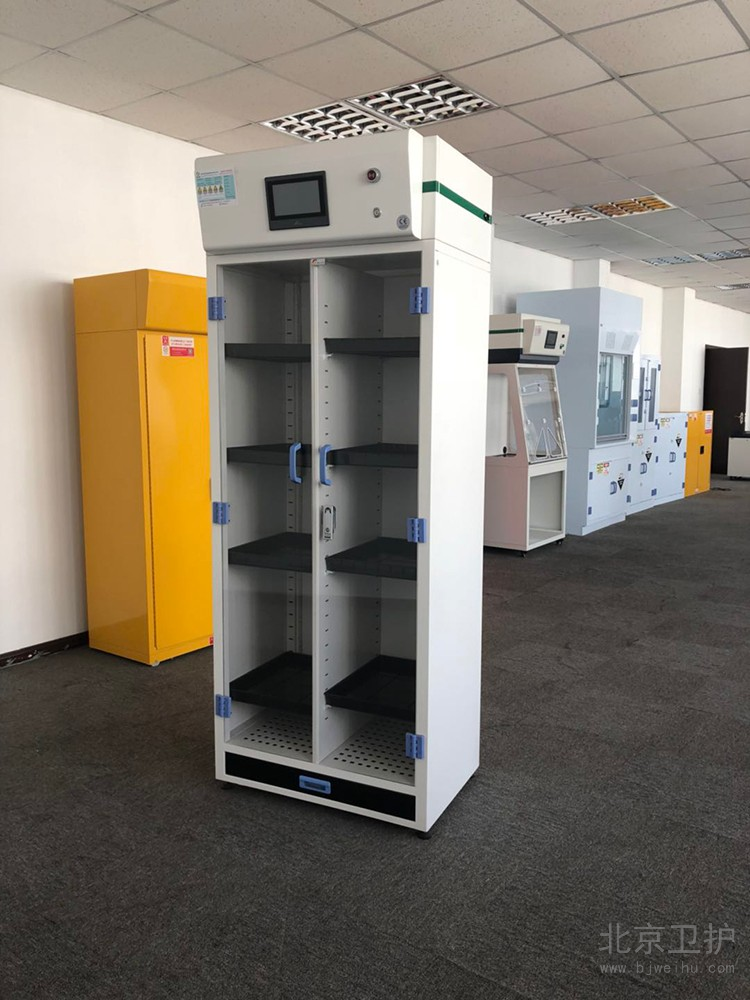 凈氣型儲藥柜頂部配備風(fēng)機(jī)和過濾裝置,風(fēng)機(jī)運(yùn)轉(zhuǎn)使得柜內(nèi)形成負(fù)壓,空氣從進(jìn)氣口進(jìn)入,有毒氣體和粉塵的空氣將被活性炭過濾器和高效粒子過濾器過濾,經(jīng)過過濾后潔凈的空氣返回室內(nèi)。凈氣型儲藥柜用來保護(hù)實(shí)驗(yàn)室人員在存儲化學(xué)品時(shí)帶來的吸入危害,同時(shí)能夠24小時(shí)不間斷的對室內(nèi)空氣進(jìn)行循環(huán)過濾。